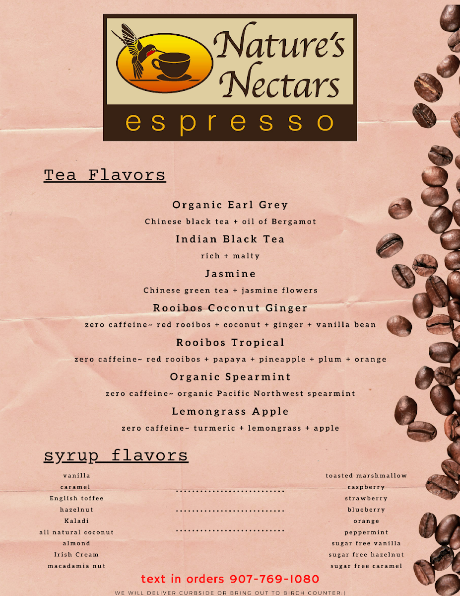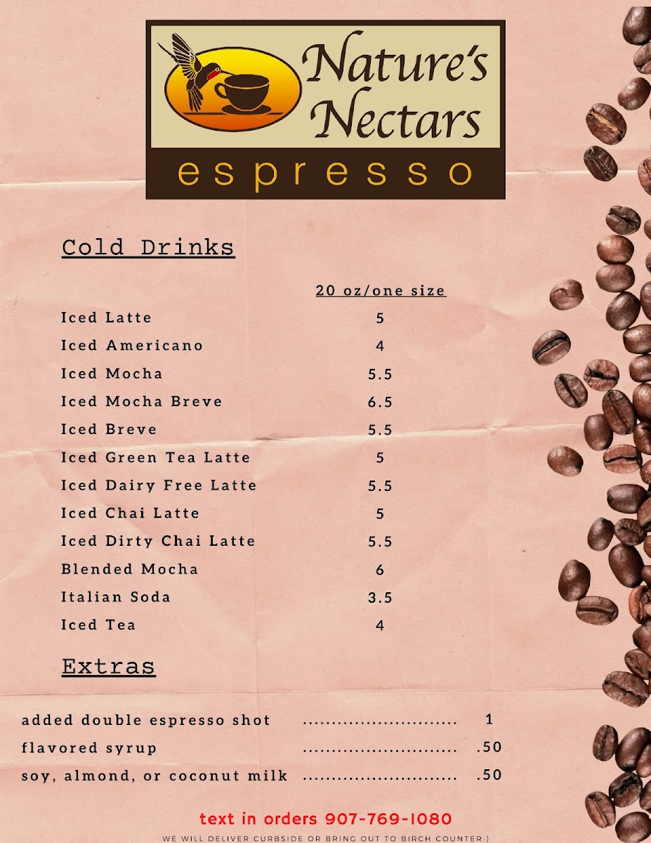 Overall, the menu at Nature’s Nectars leaves a strong impression with its focus on fresh, locally inspired flavors and thoughtfully prepared dishes that reflect the coastal character of Seward. The coffee selection is a comforting highlight, especially the smooth and well-balanced Latte, which pairs perfectly with the café’s lighter fare. Seafood clearly takes center stage, with the Halibut Ceviche standing out for its freshness and bright, citrusy flavor that feels both refreshing and refined. For something more filling, the Halibut Bites and Fries offer a satisfying, crispy option that still showcases the quality of the fish without feeling too heavy. The menu overall feels carefully curated rather than overwhelming, giving diners a mix of comforting café staples and fresh Alaskan seafood specialties, making it a memorable stop for both a quick bite and a relaxed meal.